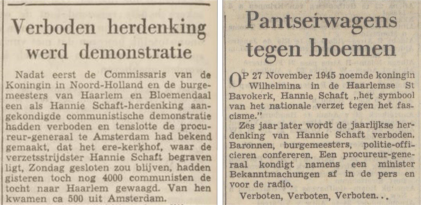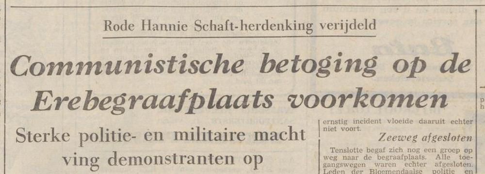 Op de Eerebegraafplaats Bloemendaal wordt jaarlijks verzetsvrouw Hannie Schaft herdacht. Communisten promoten haar daarbij als symbool van het communistische verzet. De commissaris van de Koningin in Noord-Holland, baron de Vos van Steenwijk, besluit daarom in 1951 de herdenking te verbieden. Hij vreest een communistische demonstratie en regelt uit voorzorg politie, soldaten en vier pantserwagens.