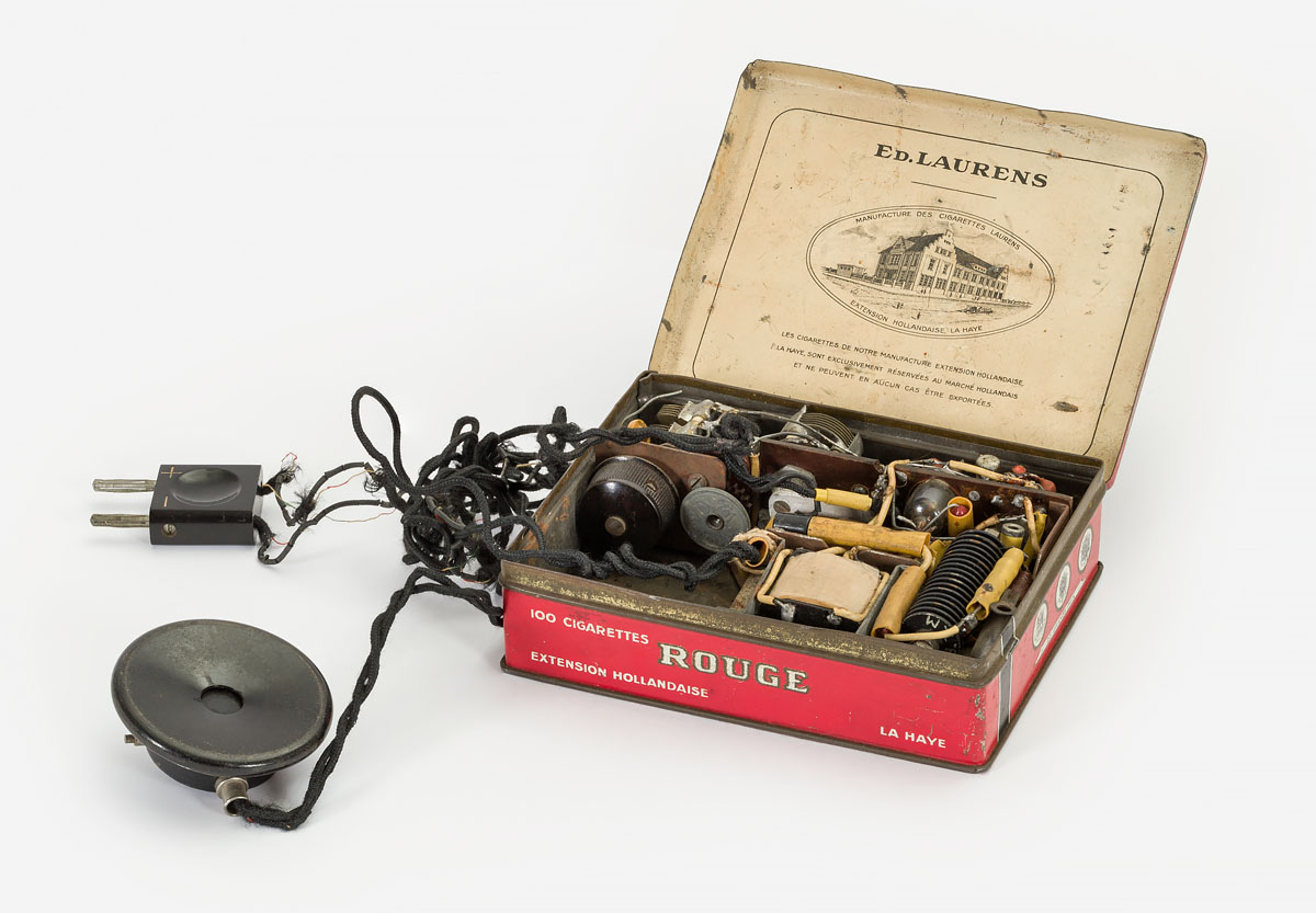 Zelfgebouwde radio in een sigarettenblik, gemaakt in 1942 door een elektrotechnisch ingenieur om naar Radio Oranje te luisteren.